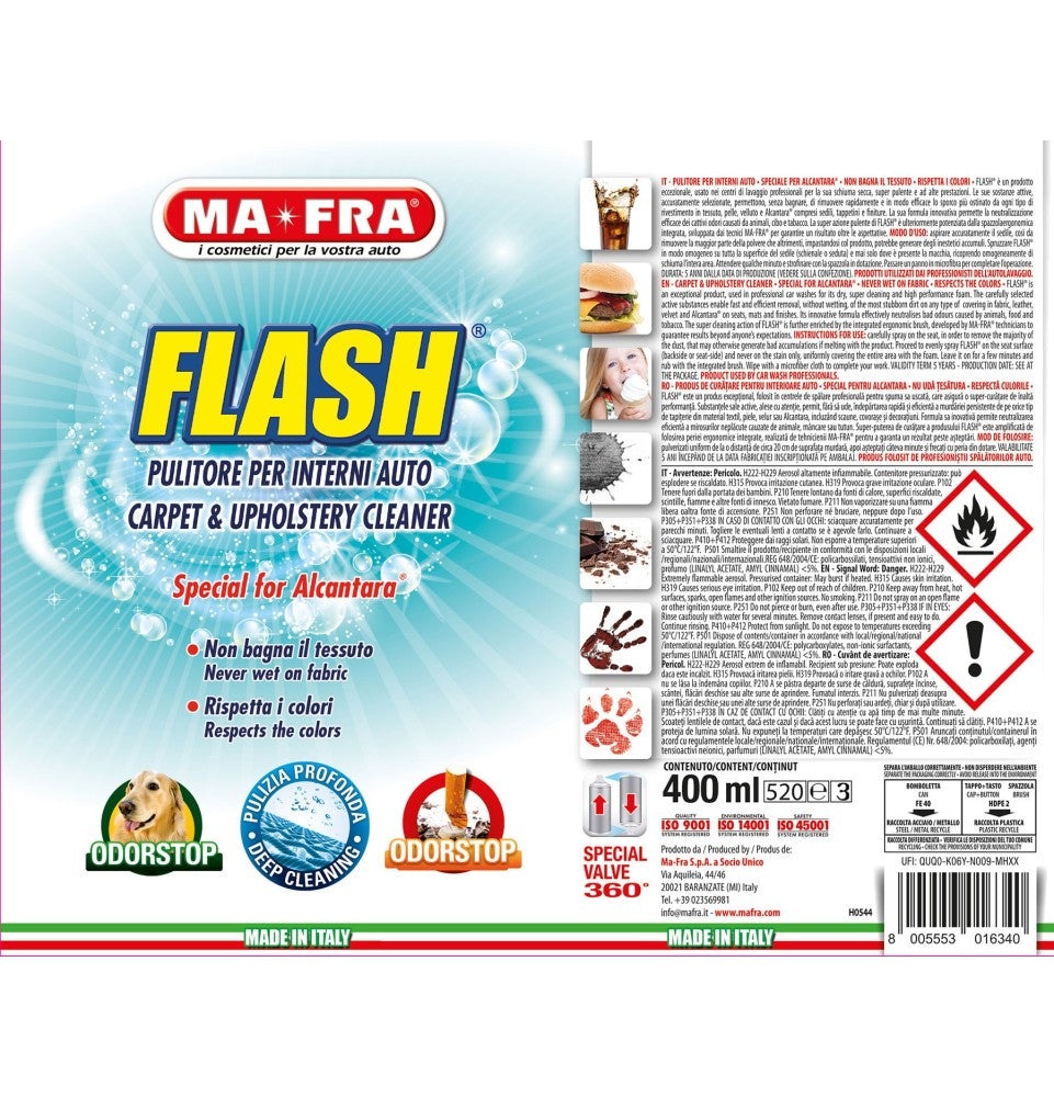 Flash di Mafra rappresenta l’eccellenza nella pulizia a secco degli interni auto. Agisce con rapidità, senza inumidire la superficie, eliminando le macchie dai sedili e dalle moquette. È ideale per pulire a secco e smacchiare il sedile auto, tappetini e finiture in ogni tipo di rivestimento, tessuto, velluto e Alcantara.